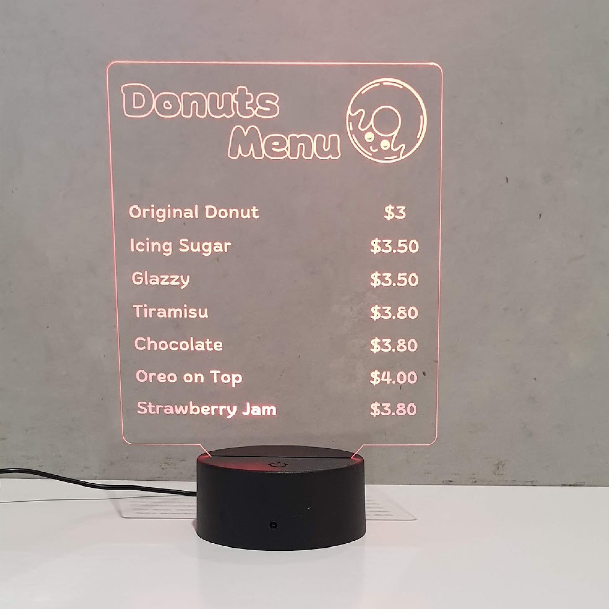 The LED Business Display is engraved with your Business Logo and/or QR Code that can include a price list on 3mm thick Shatterproof Clear Acrylic. The Glow of the Business Display Light is Bright with 15 individual colours to choose from and will look great during the day and at night. Available in a Horizontal Style (16 cm Tall by 16cm Wide) or Vertical Style (22cm Tall by 14cm Wide), the Business Display light will sit perfectly on Reception Table, Front Counter, or Temporary Counter at a Market.