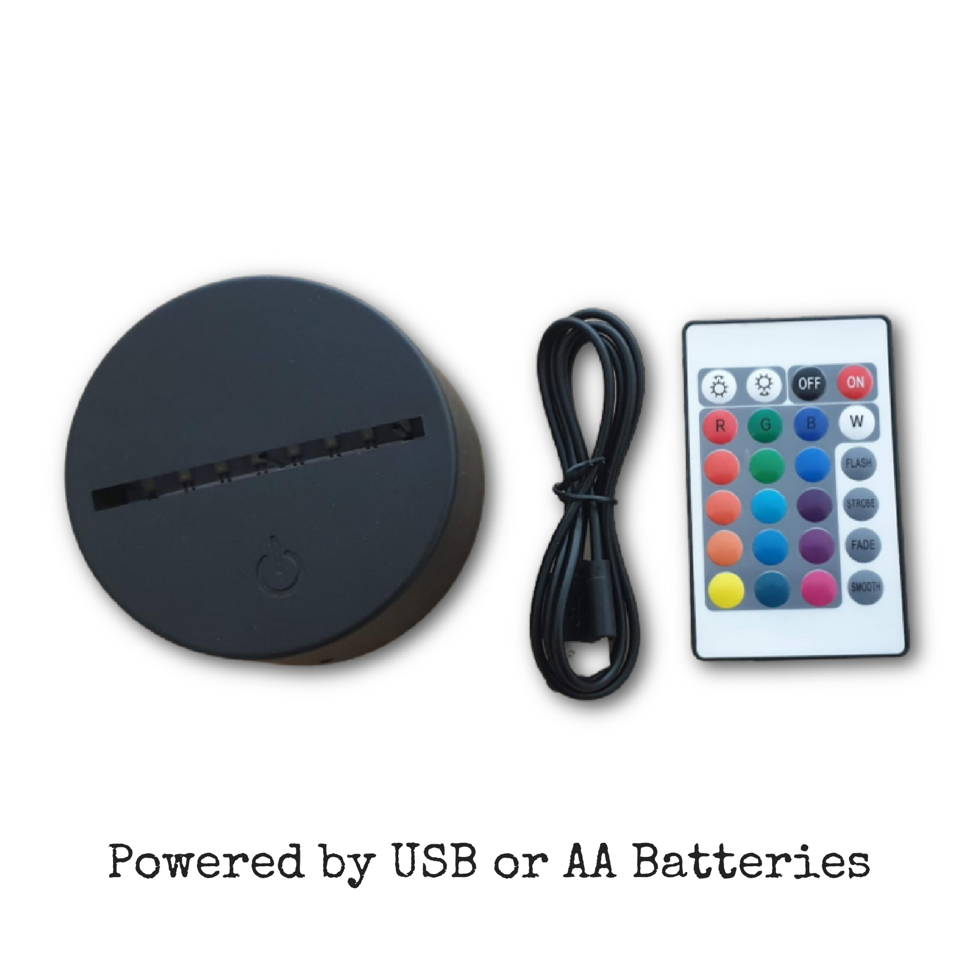 The Acrylic is inserted into the Black LED Base and can be easily removed for safe packing. Supplied with a Box and protective Foam inserts, that can be used to safely pack away the Display Light. The LED Base is powered by 3 x AA Batteries (Not Included) or a USB-supplied cord. The LED Base can be powered ON / OFF via a button on the LED base or ON / OFF button on the supplied USB power cord. The Colour can be changed using the button on the LED Base or the supplied remote control.