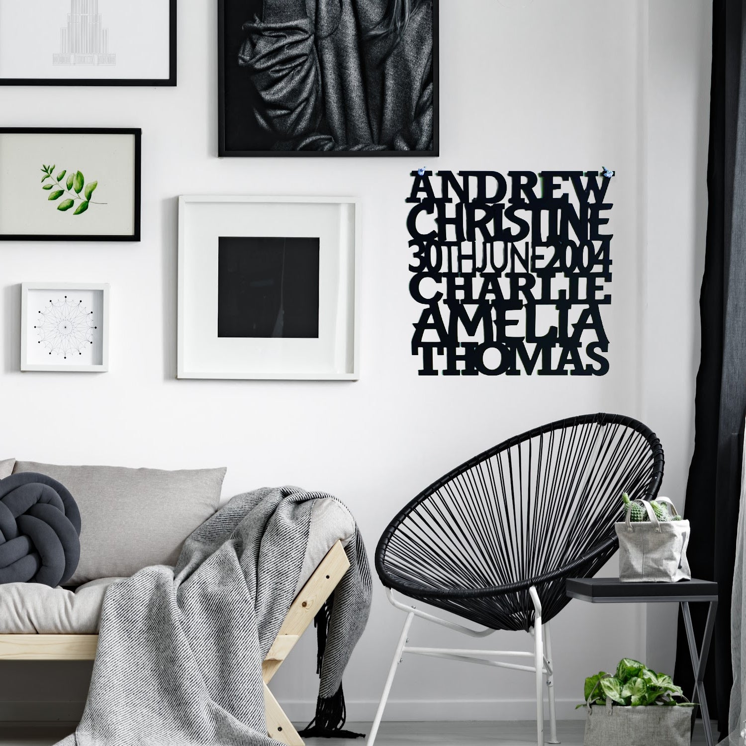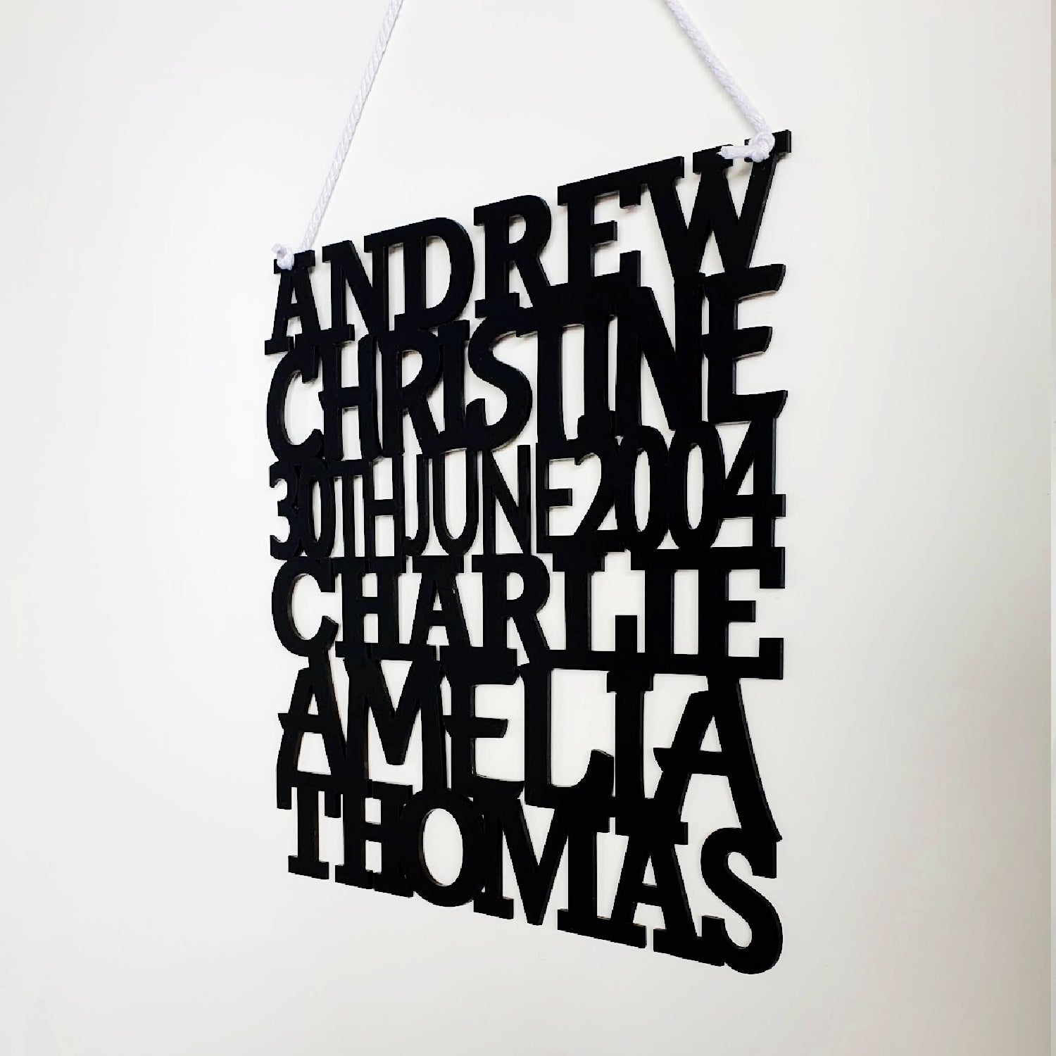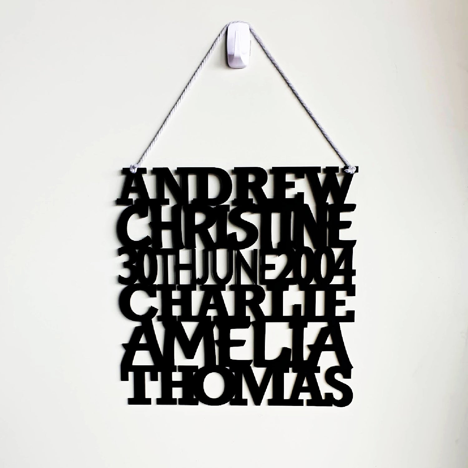 The Name Stack Plaque is lightweight, easy to mount on a wall with fishing line or double-sided tape, and can be displayed on an easel. The sizes available for the plaque are 30cm x 30cm, 40cm x 40cm or 50cm x 50cm. If you require a custom size or shape, message FAME-ily Art with your requirements before ordering.
